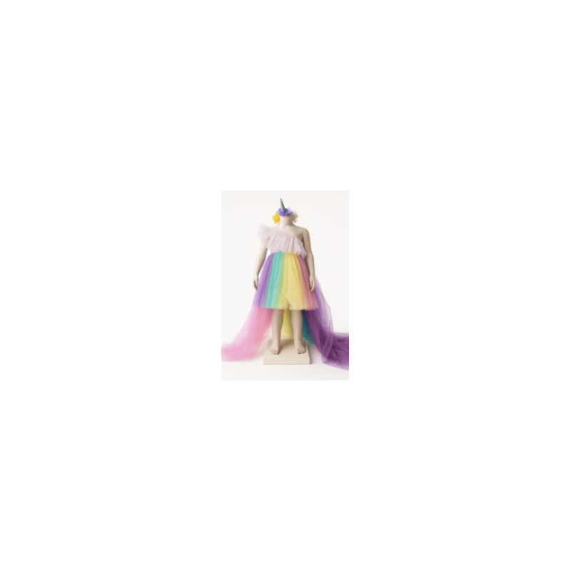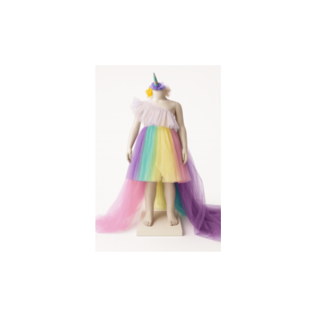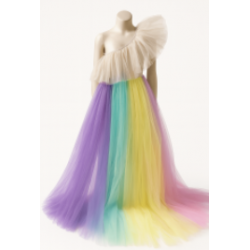 113899 Rochie asimetrica, pe un umar, din tulle multicolor cu trena.
