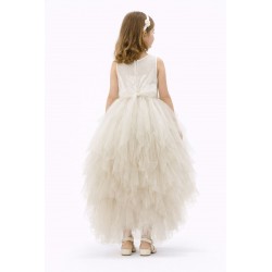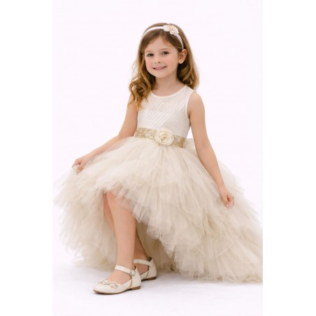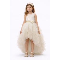 1645H Rochie asimetrica din tul; Corsetul prezinta un model tip caroiaj, cu o textura satinata. Talia este pusa in evidenta de o centura aurie cu paiete, accesorizata cu o floare laterala si cu o funda din tul in spate.