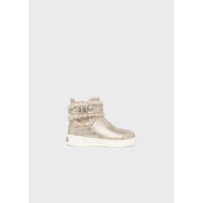 Exterior din materiale combinate. Interior captusit si brant din bumbac respirabil. Talpa usoara si flexibila din cauciuc. Inchidere cu fermoar lateral pentru o fixare rapida si simpla. Elemente decorative tip stras. Detaliu decorativ din blana. Efect metalizat.