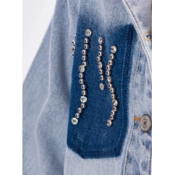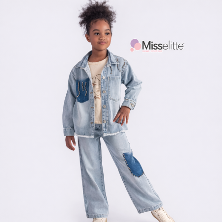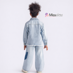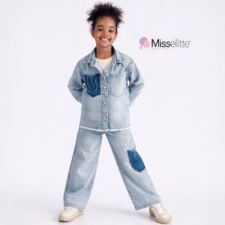00470 Ținuta este formată dintr-un set denim alcătuit din bluză crem cu mânecă lungă, jachetă și pantaloni din blugi. Jacheta are croială lejeră, se închide cu nasturi metalici pe partea frontală și include un buzunar aplicat din denim închis, decorat cu mărgele. Pantalonii au croială dreaptă și prezintă un patch din denim închis pe unul dintre genunchi, decorat în același stil. Tricoul cu mânecă lungă este crem și prezintă un imprimeu minimalist.