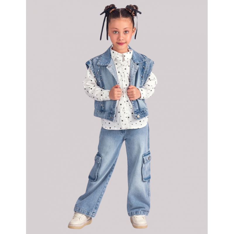 00475 Ținuta este compusă dintr-o cămașă albă cu imprimeu steluțe negre, o vestă denim fără mâneci și o pereche de pantaloni largi din denim albastru deschis. Vesta are detalii cu ținte metalice pe partea frontală și două buzunare laterale. Pantalonii au buzunare laterale tip cargo, cu clapete și nasturi.