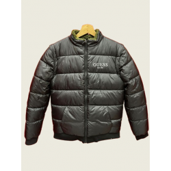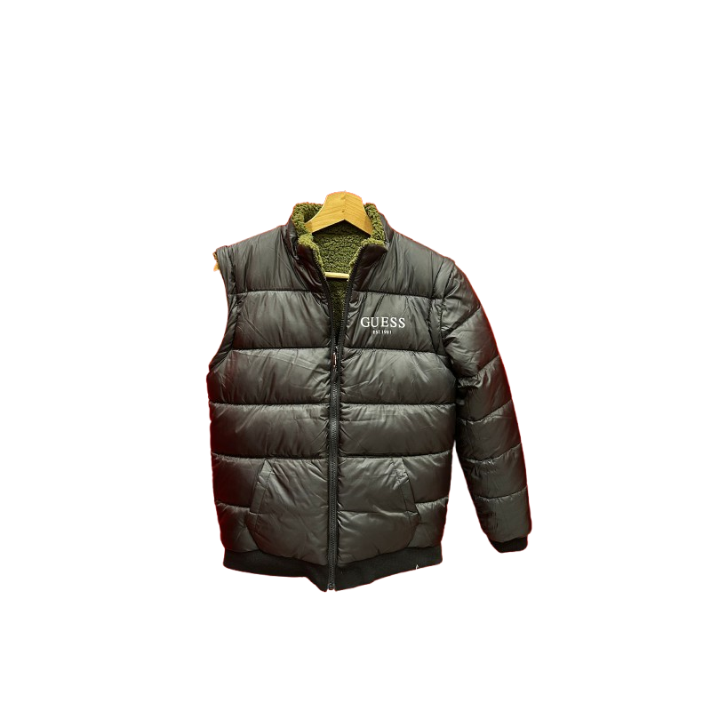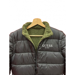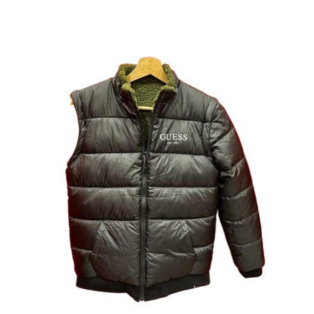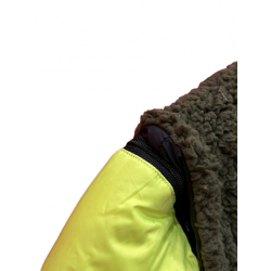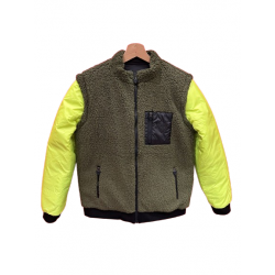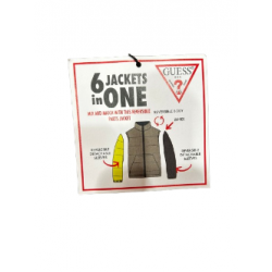 L2BL08 Geaca reversibila Guess 6-în-1, cu maneci detasabile si reversibile. Interiorul gecii este din blanita kaki, cu doua buzunare laterale si unul la piept (toate cu inchidere prin fermoar), iar manecile sunt galbene, respectiv negre pe exterior.