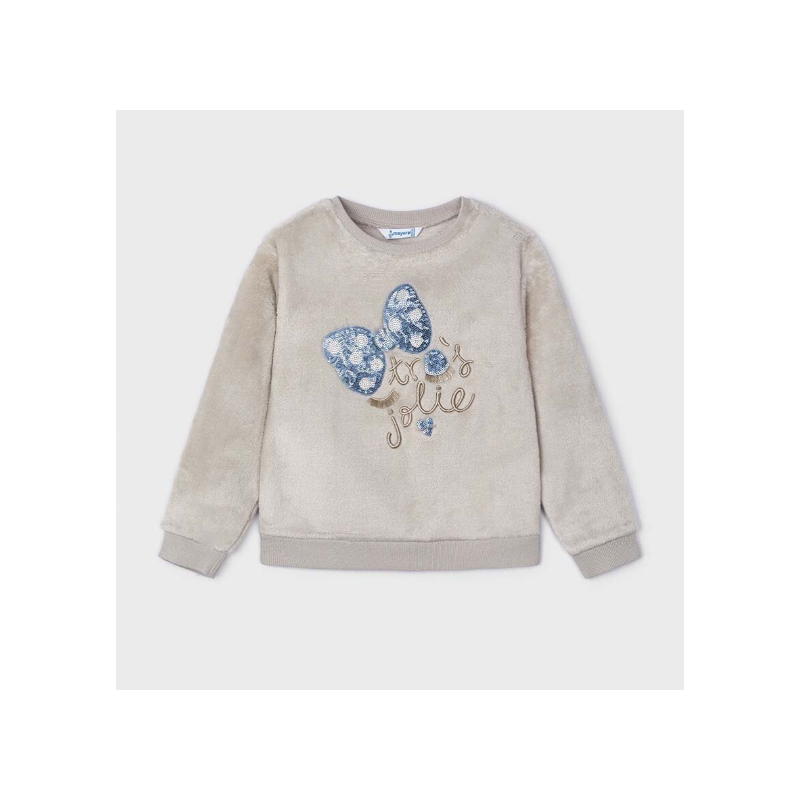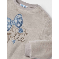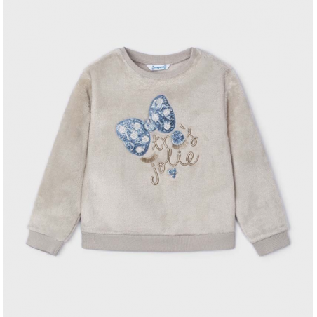 4480M Bluza este pentru copii, confecționată din material plușat, de culoare bej deschis. Are mâneci lungi, guler rotund și manșete elastice, la fel ca tivul inferior. Materialul moale și aspectul pufos o fac potrivită pentru zile mai reci.