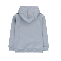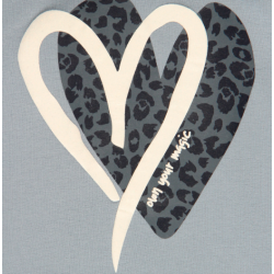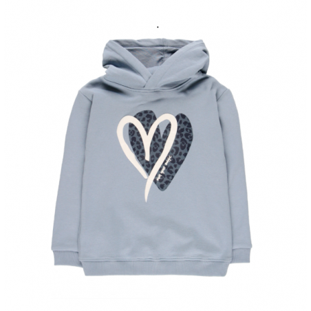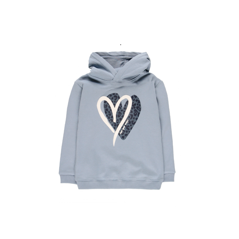 Hanorac pentru fete, de culoare bleu, cu glugă și mânecă lungă. Modelul are tiv și manșete elastice. Pe partea frontală prezintă un imprimeu format din două forme de inimă, suprapuse. Materialul este moale, potrivit pentru vremea răcoroasă.