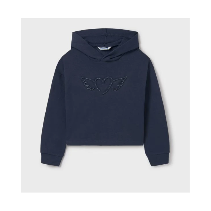 07469M Hanorac pentru copii, de culoare bleumarin închis, cu glugă și mânecă lungă, marca Mayoral. Modelul are croială dreaptă și manșete elastice la mâneci.