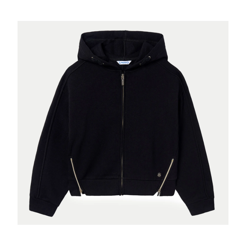 7487M Hanorac negru pentru copii, cu glugă și închidere frontală cu fermoar metalic. Modelul are croială dreaptă și mâneci lungi. Pe partea frontală inferioară se află două buzunare verticale, fiecare prevăzut cu fermoar metalic oblic. Manșetele și tivul sunt elastice, iar materialul este unul moale și confortabil.