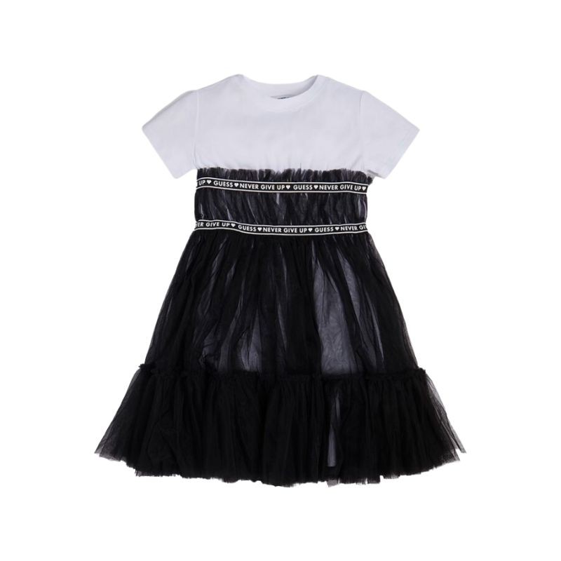 Rochie GUESS albă tip tricou, cu inserții de tul negru și bandă logo in talie.