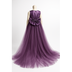 Rochie violet inchis cu trena, confectionata din multiple straturi de tul subtire.